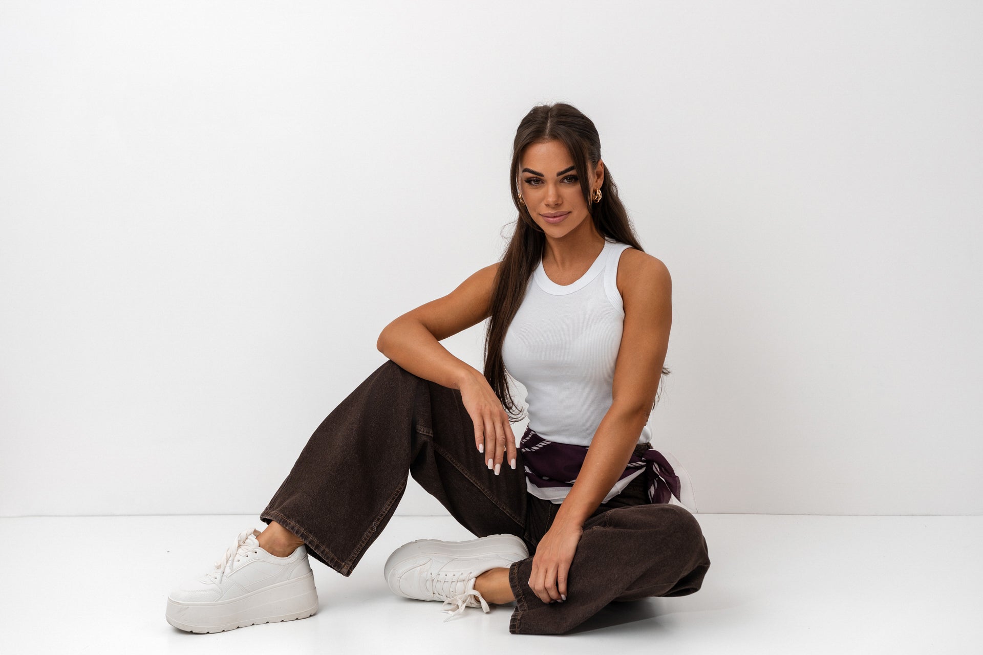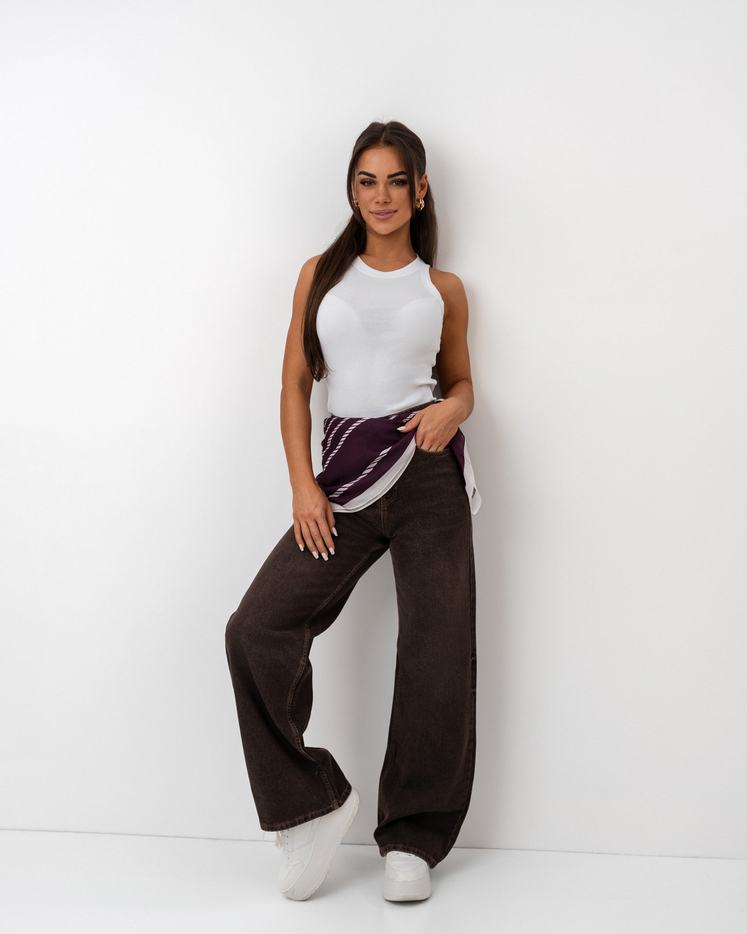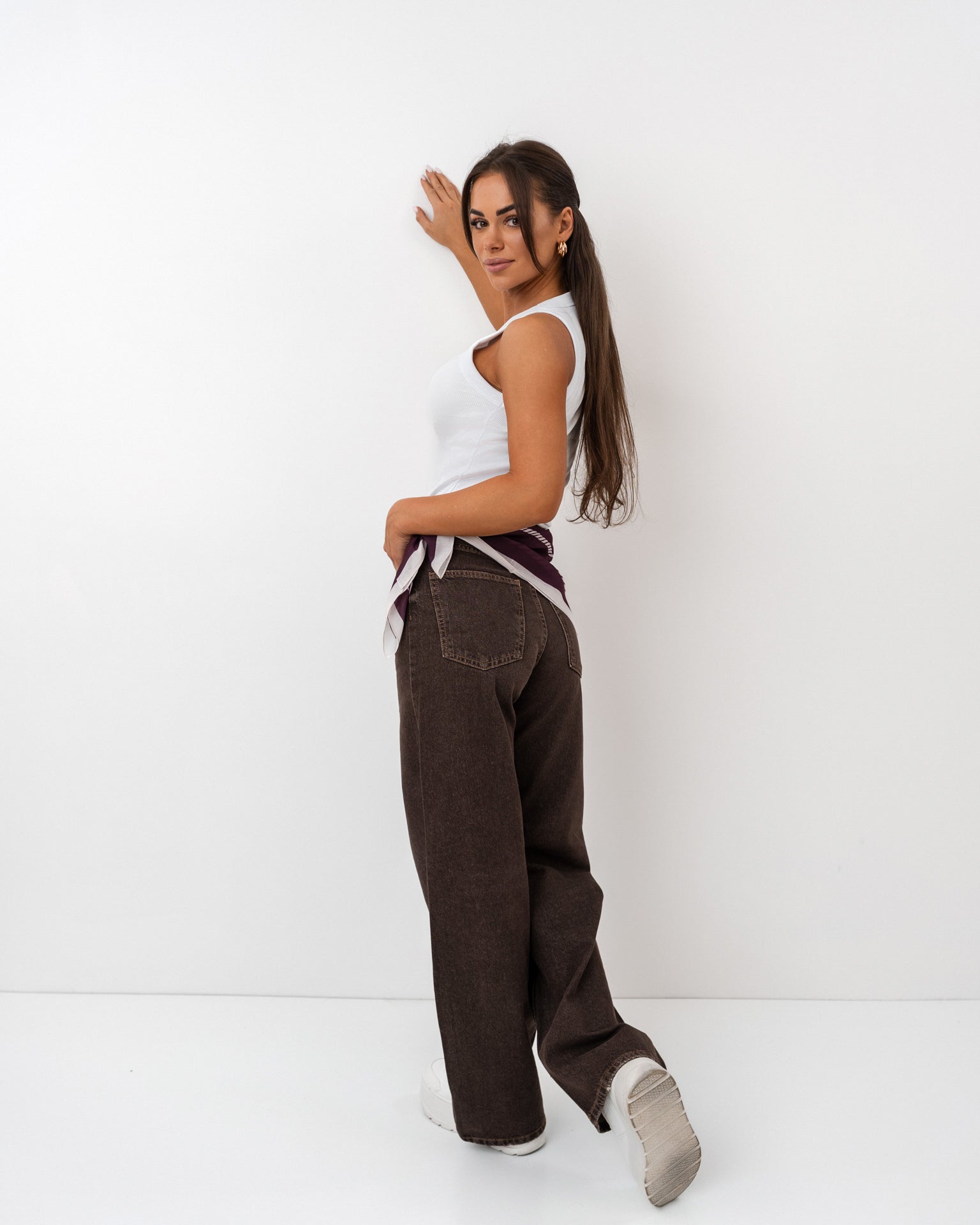Jeansy z wysokim stanem w odcieniu czekoladowego brązu, uszyte z miękkiego, lekko spranego denimu. Szeroka nogawka optycznie wydłuża sylwetkę, a wysoki stan podkreśla talię. Modnym akcentem jest chusta przewiązana w pasie – można ją nosić lub zdjąć, tworząc prostszy look. Idealne do topu i sneakersów na co dzień lub z koszulą i obcasami na wieczór.