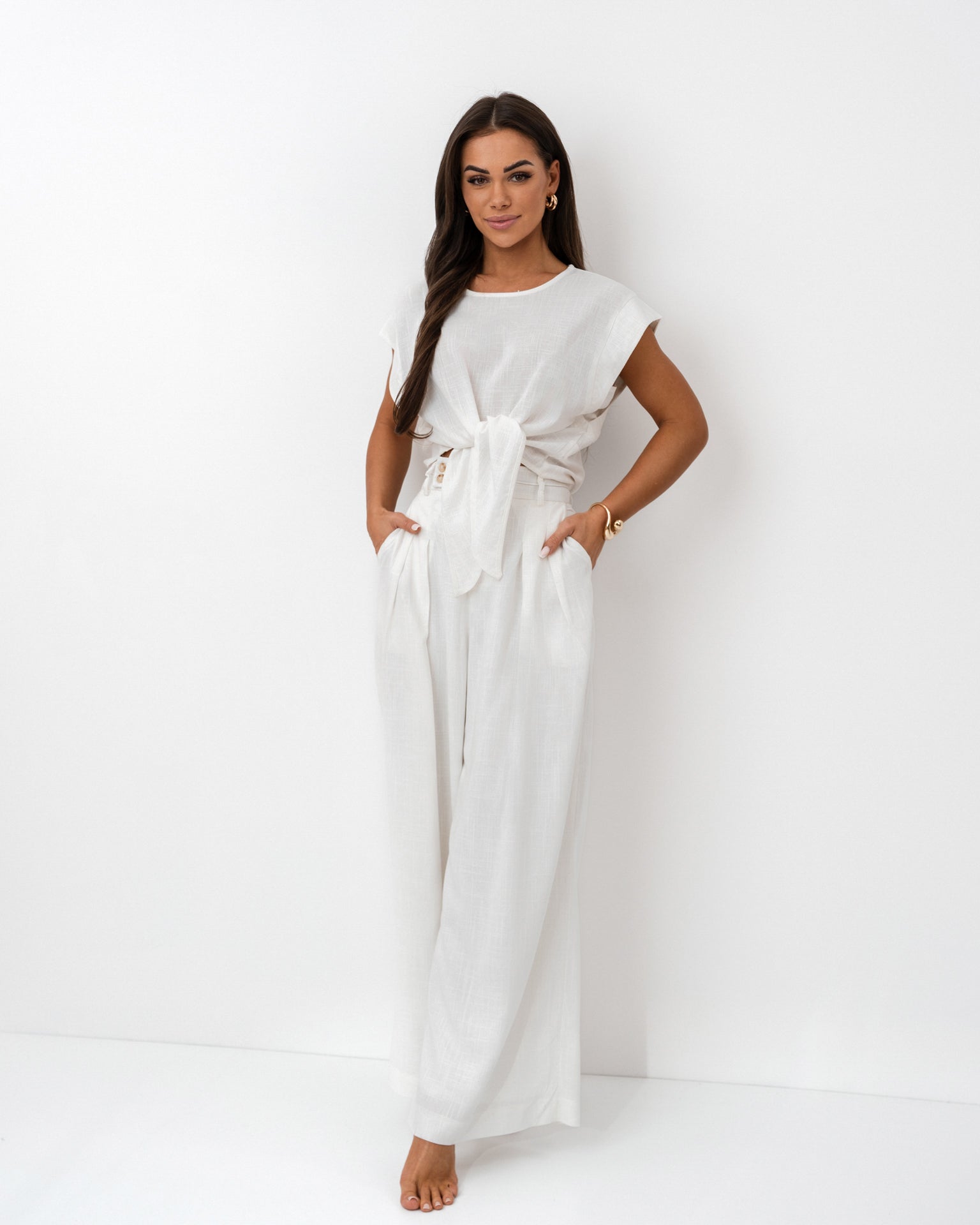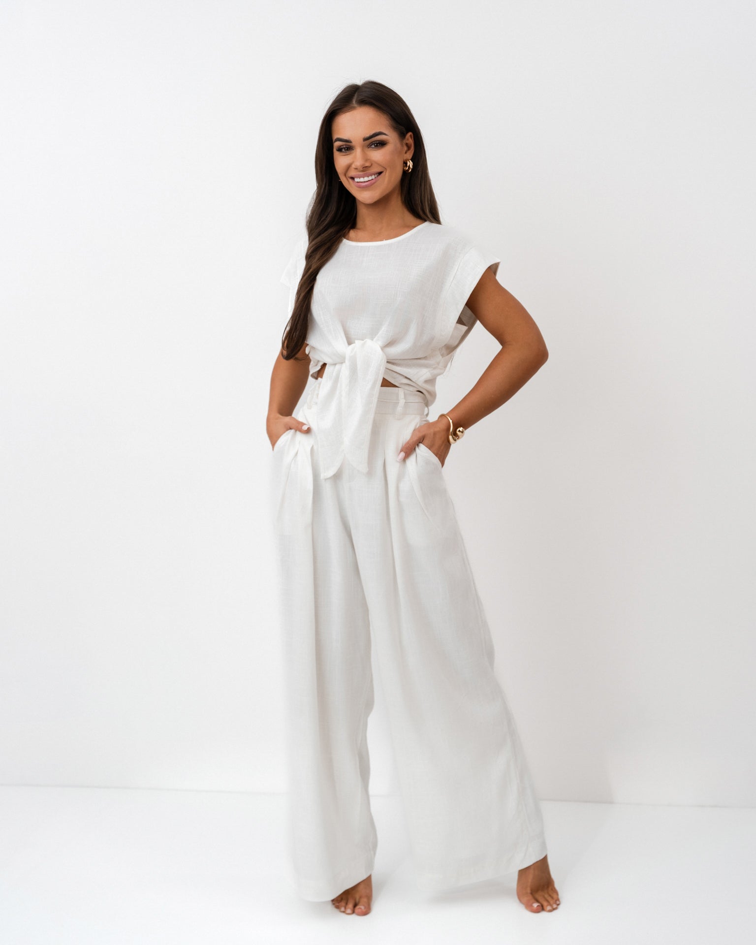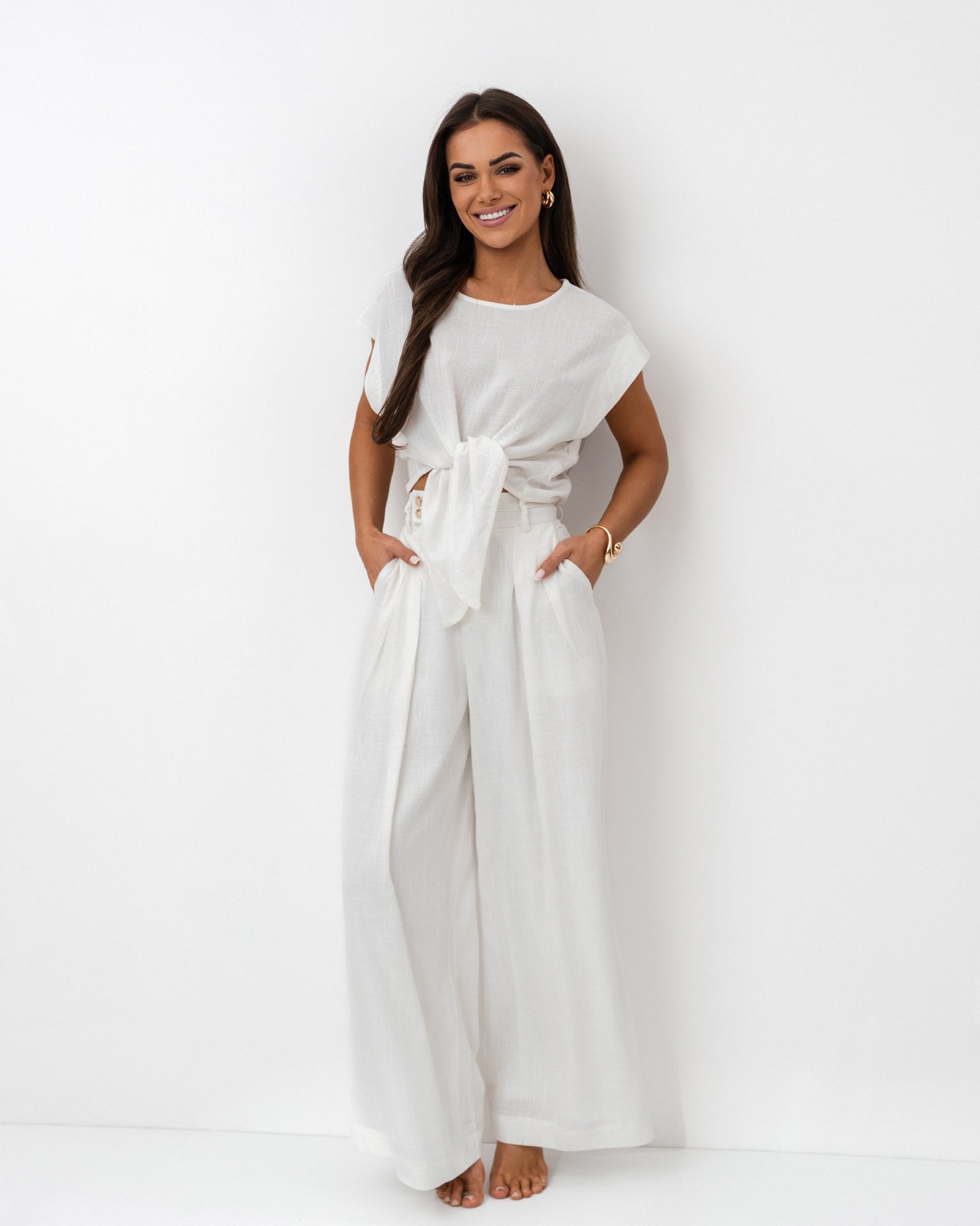 Komplet z lnu w odcieniu czystej bieli to idealna propozycja na lato – lekki, stylowy i niezwykle komfortowy. Składa się z krótkiego topu z wiązaniem w talii oraz szerokich, eleganckich spodni z wysokim stanem. Krój podkreśla sylwetkę, eksponując talię i wydłużając nogi, a naturalna tkanina zapewnia wygodę przez cały dzień.