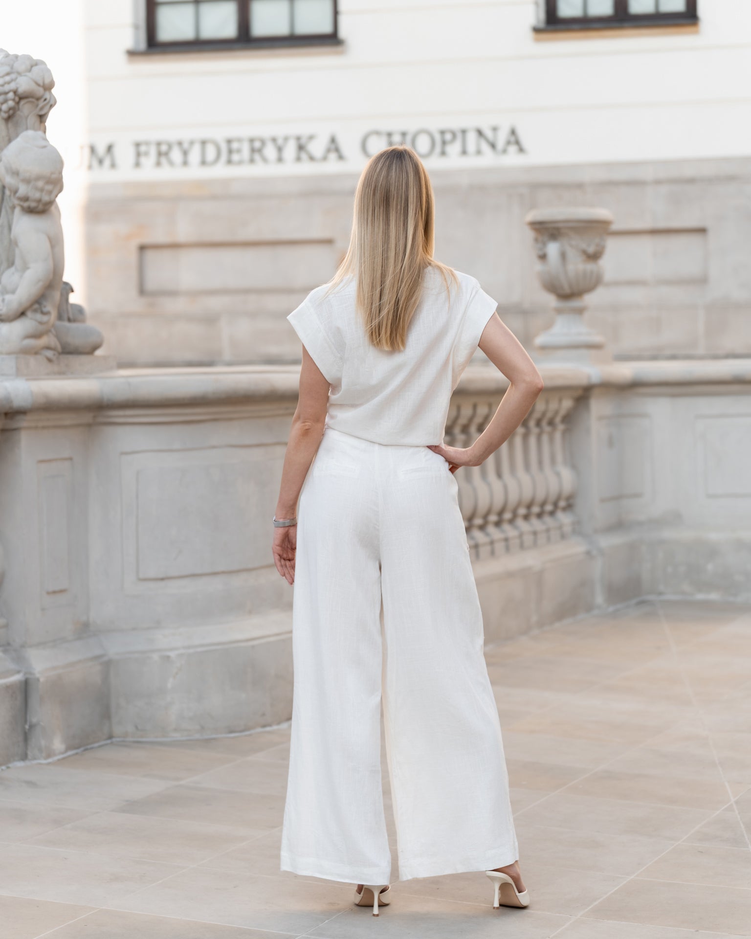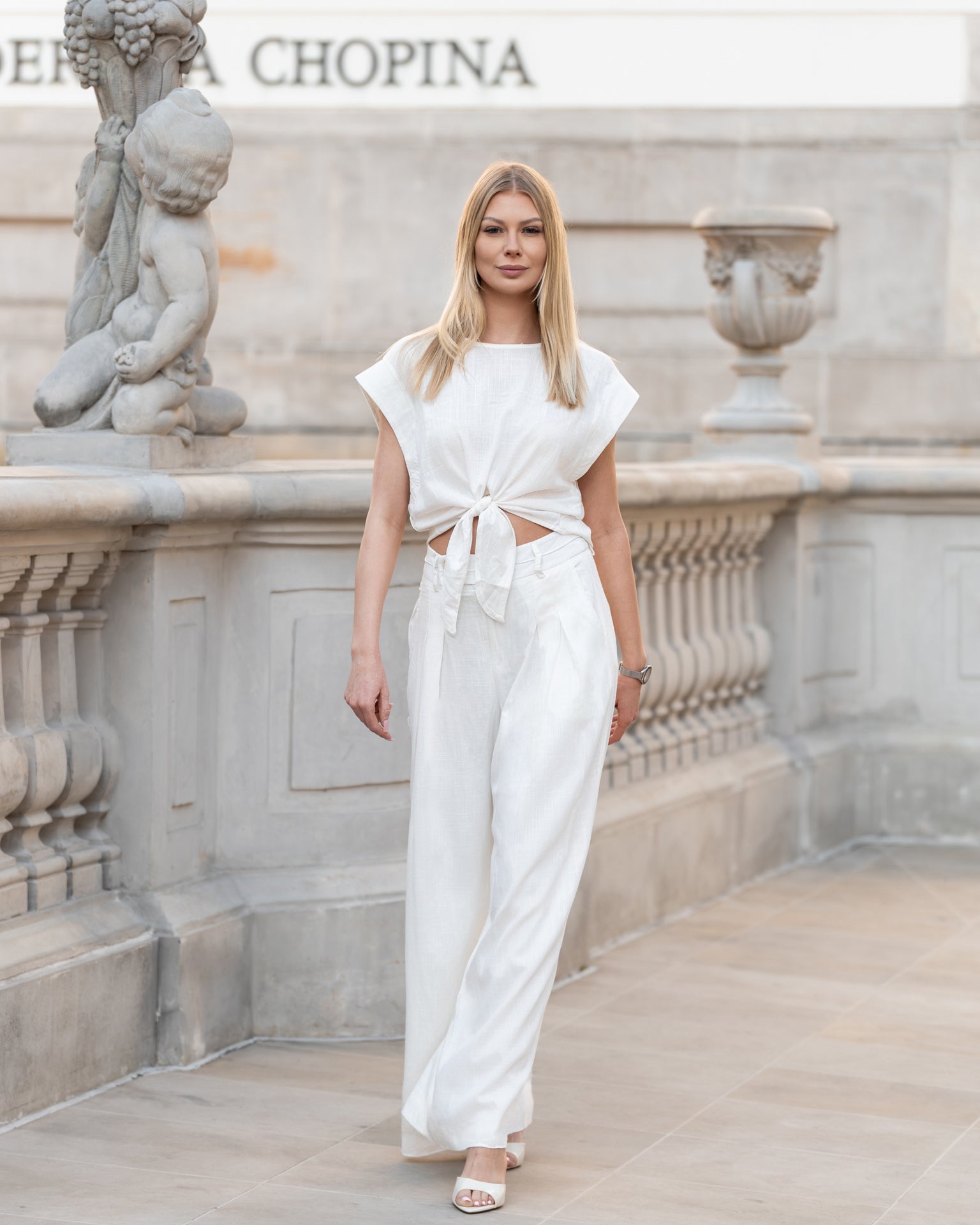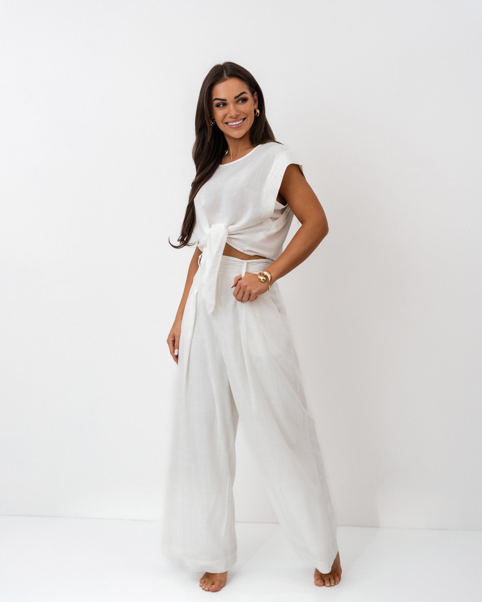 Komplet z lnu w odcieniu czystej bieli to idealna propozycja na lato – lekki, stylowy i niezwykle komfortowy. Składa się z krótkiego topu z wiązaniem w talii oraz szerokich, eleganckich spodni z wysokim stanem. Krój podkreśla sylwetkę, eksponując talię i wydłużając nogi, a naturalna tkanina zapewnia wygodę przez cały dzień.