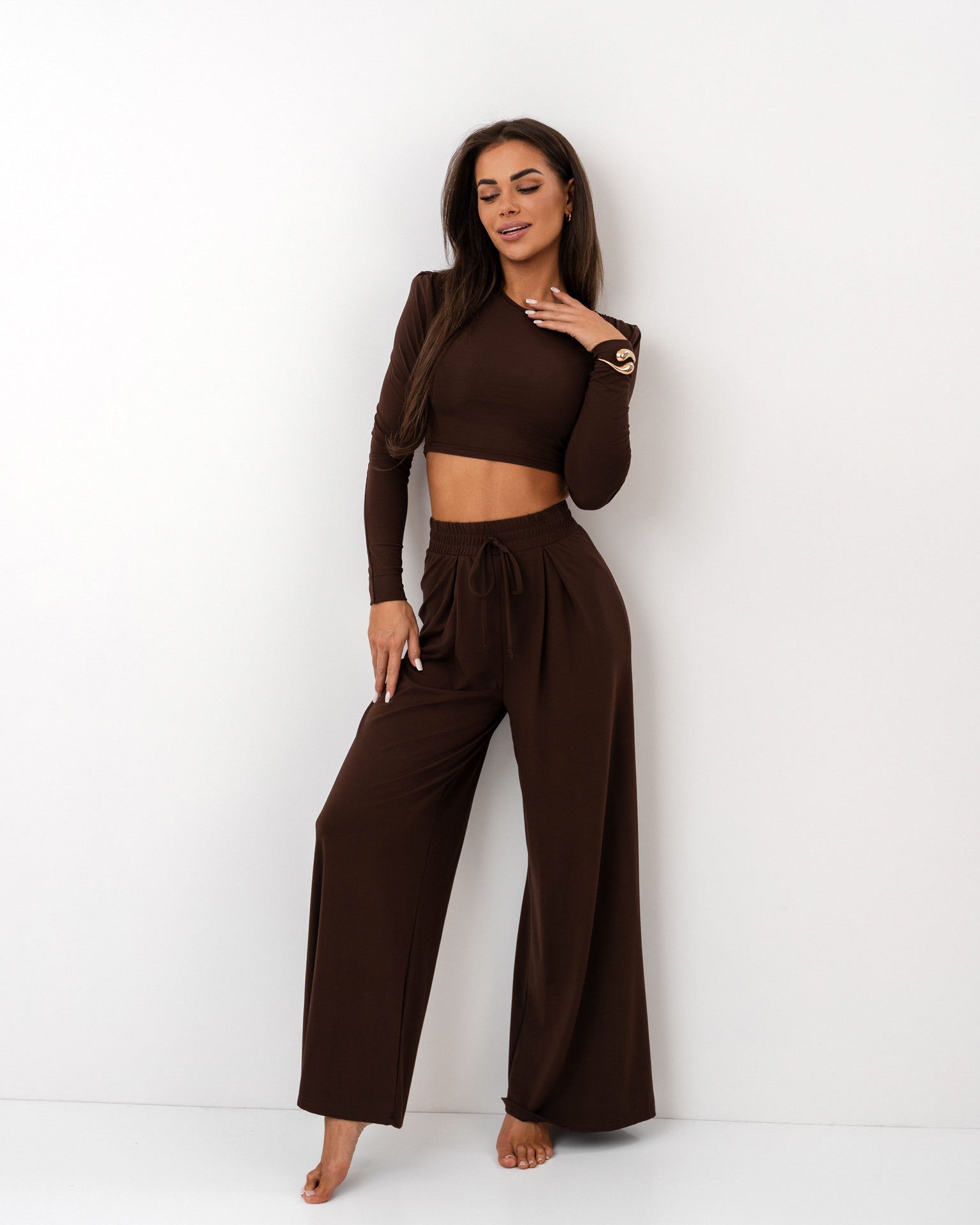 Komplet z wysokiej jakości elastycznej dzianiny w odcieniu czekoladowego brązu. Składa się z dopasowanego crop topu z długim rękawem oraz szerokich spodni z elastycznym pasem i troczkiem. Materiał jest miękki, gładki i niezwykle przyjemny w dotyku – zachowuje kształt nawet po wielu praniach. Stylowy, wygodny i elegancki w swojej prostocie – idealny zarówno do noszenia na co dzień, jak i w domu.