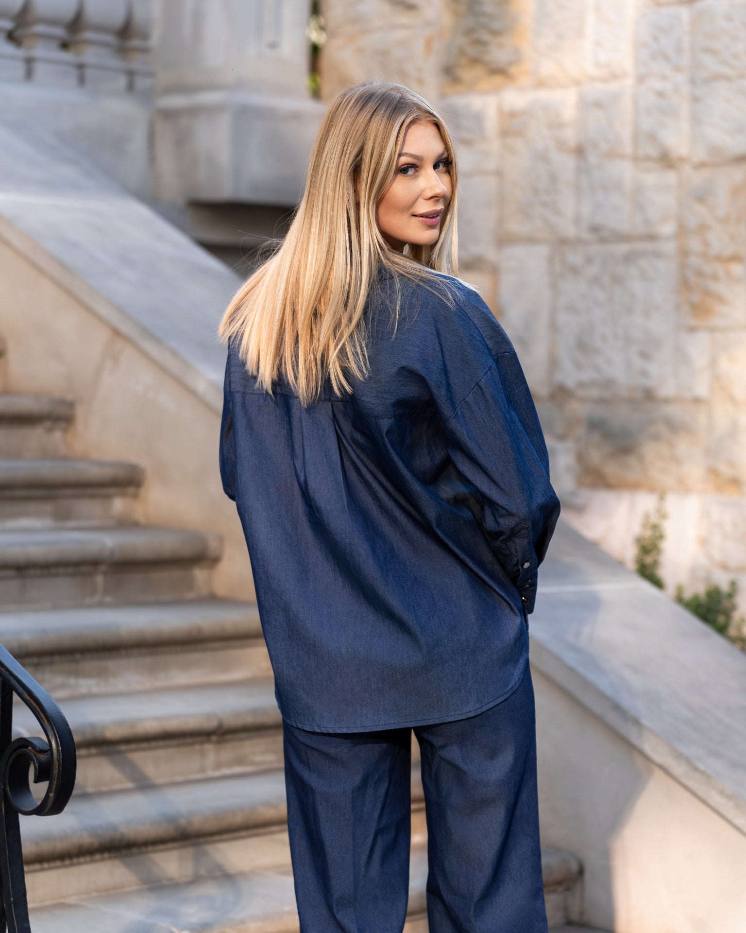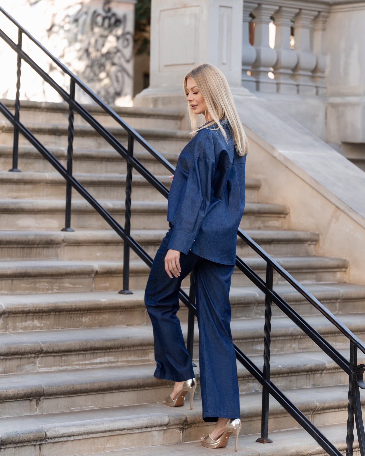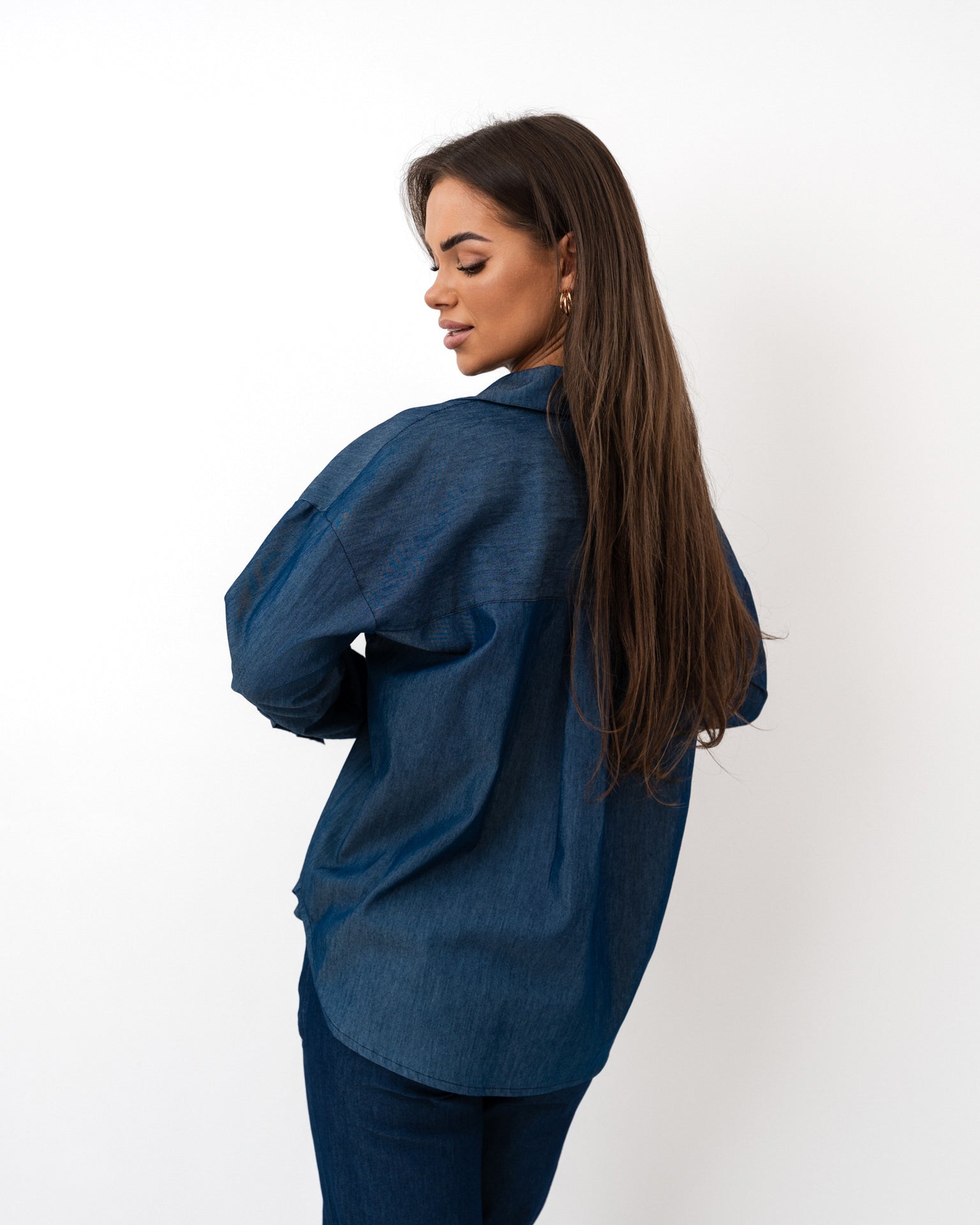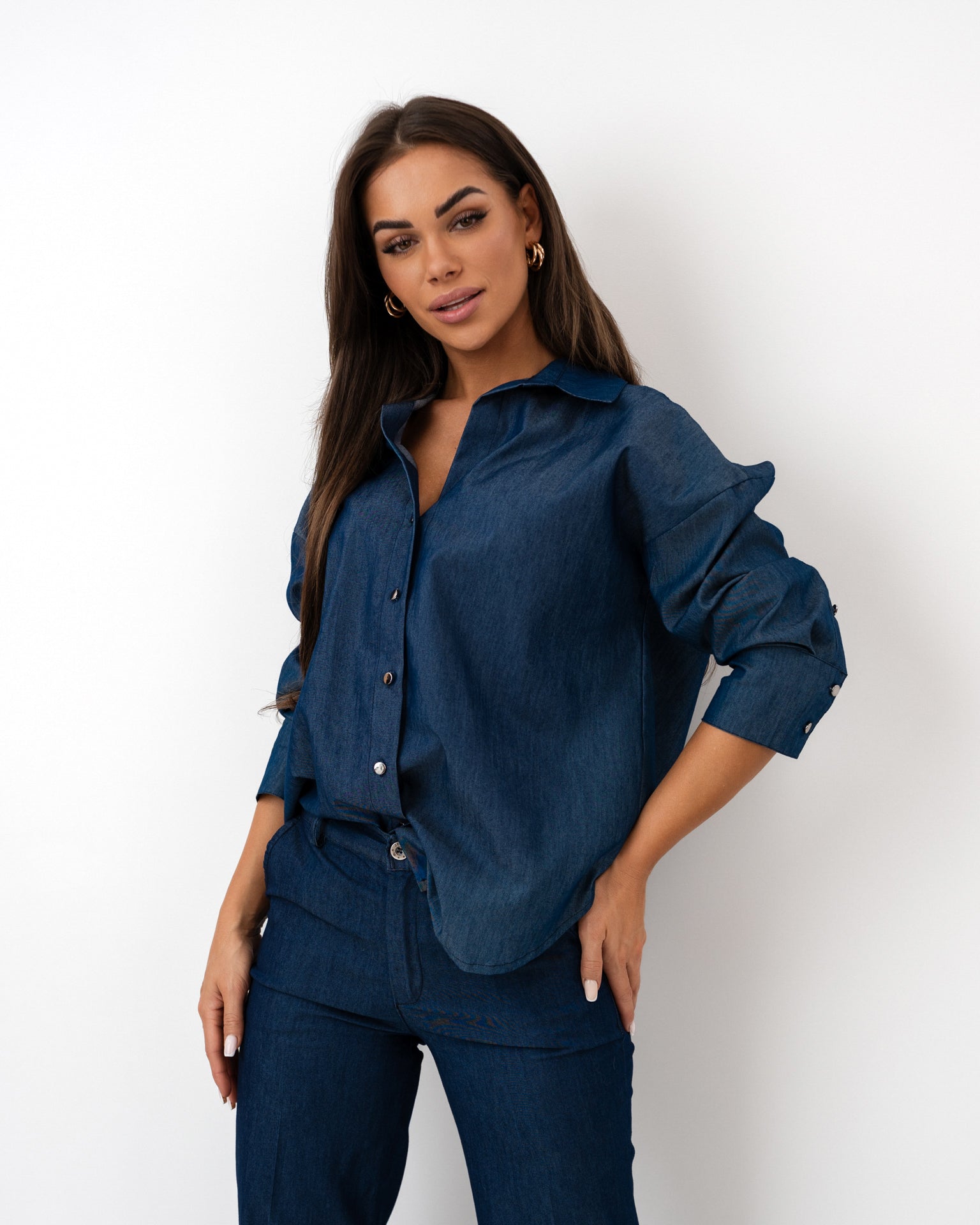 Elegancki komplet w głębokim odcieniu granatu to nowoczesna interpretacja klasyki – idealna dla kobiet ceniących styl i wygodę. Składa się z oversize’owej koszuli z długim rękawem oraz szerokich spodni z wysokim stanem. Luźna góra zestawiona z dopasowanym dołem tworzy zrównoważoną, wydłużającą sylwetkę formę, dodając całości nonszalanckiego szyku.