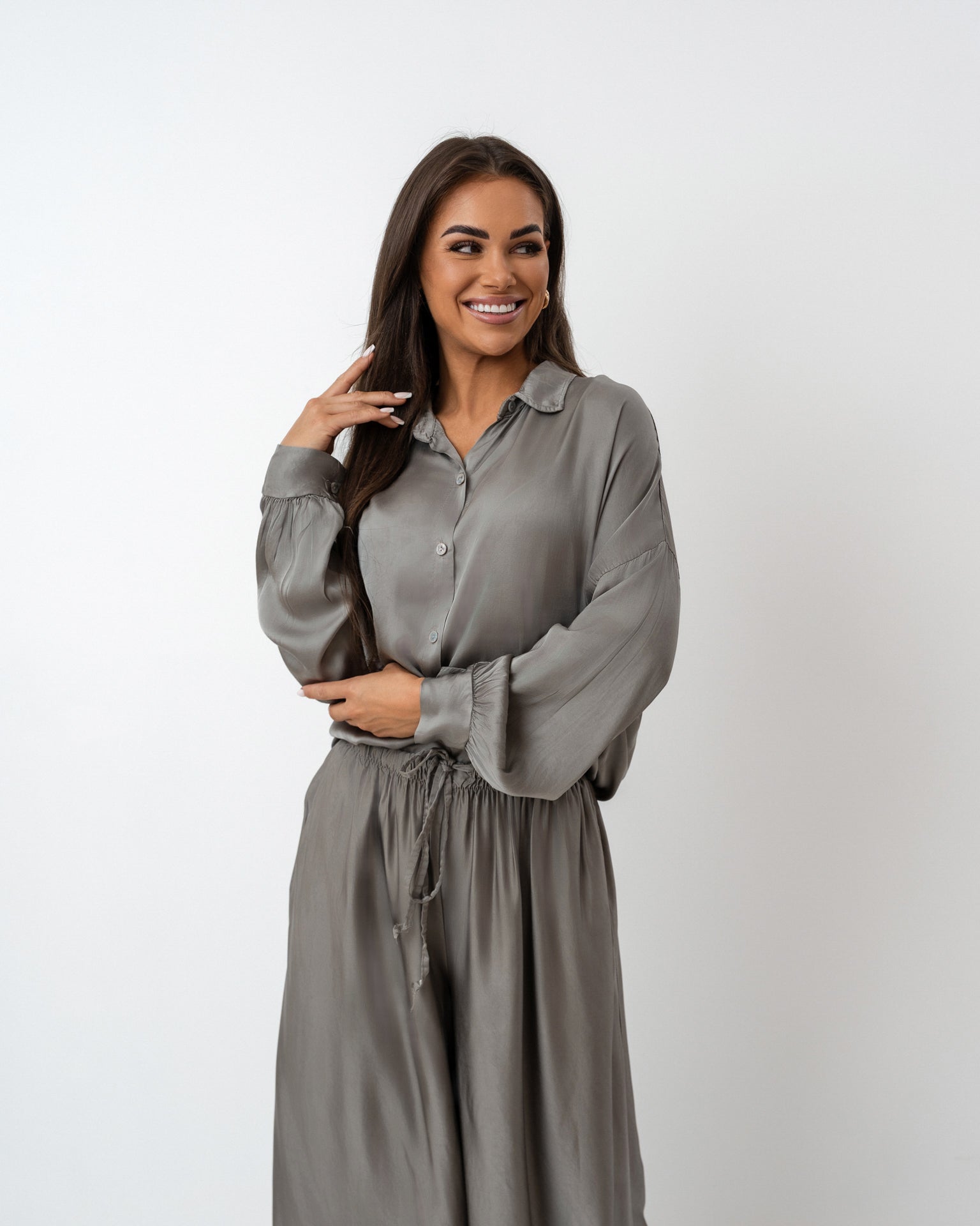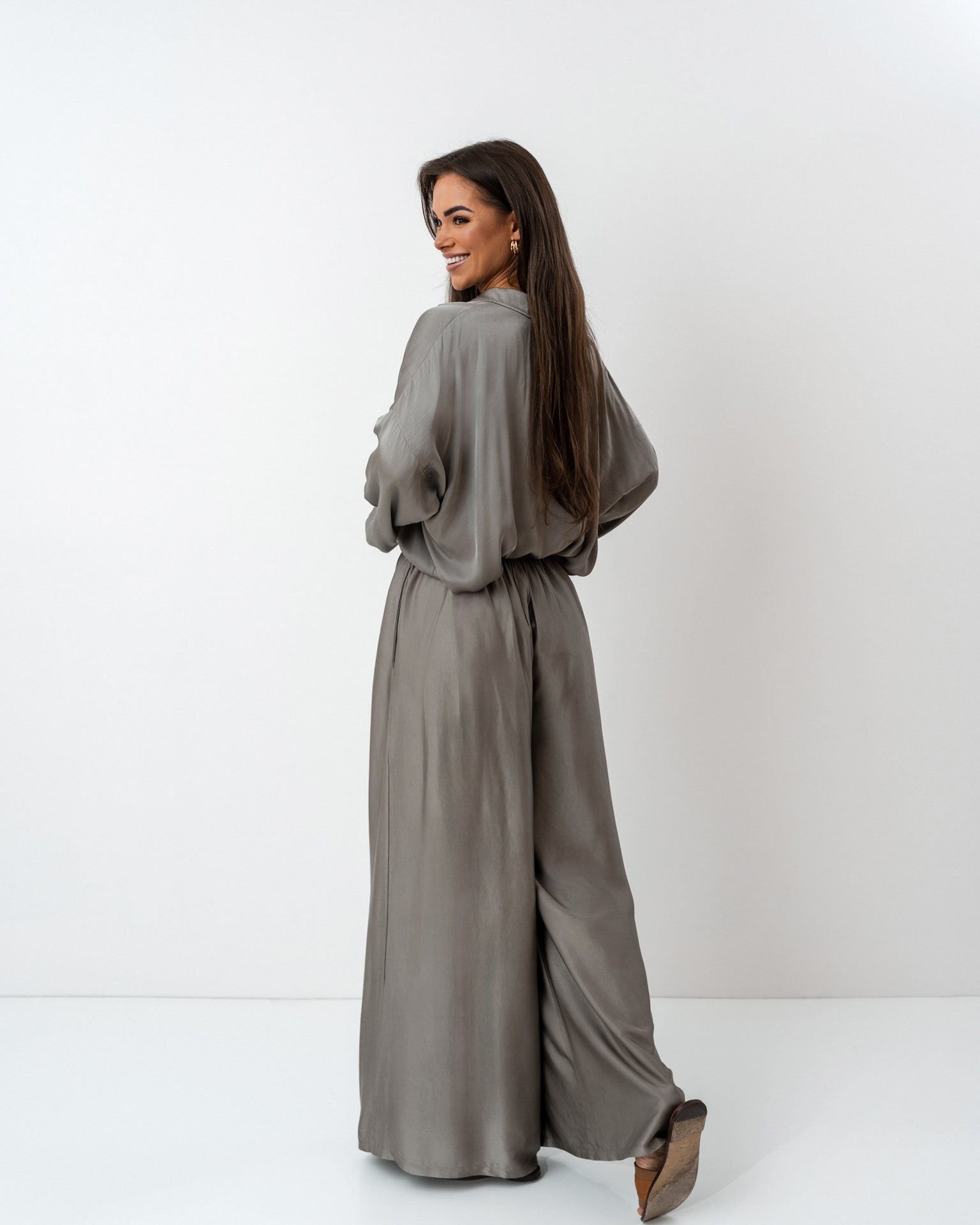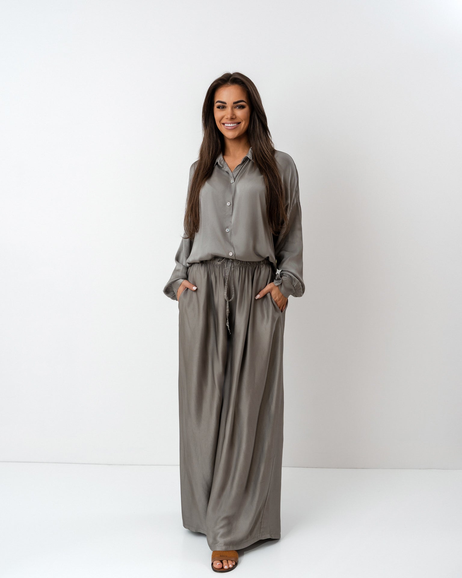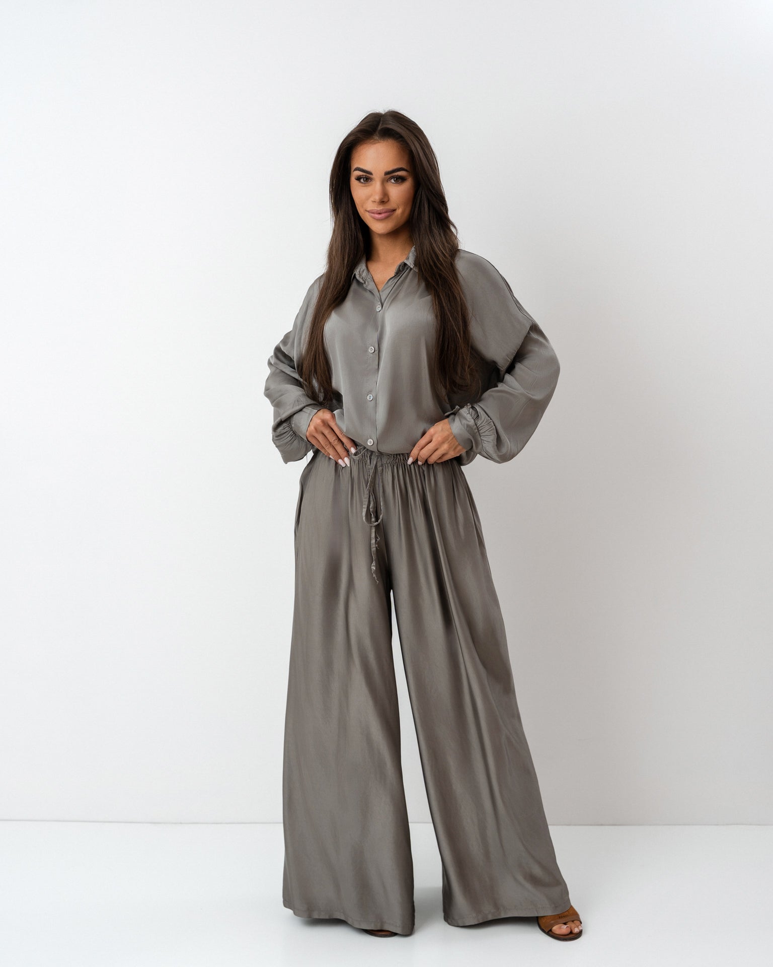 Wyjątkowy komplet w odcieniu szarego beżu uszyty z delikatnej tkaniny będącej połączeniem jedwabiu z domieszką wiskozy. Składa się z luźnej, zwiewnej koszuli z długim rękawem i wiązaniem w talii oraz szerokich, miękko układających się spodni z elastycznym pasem. Całość tworzy elegancką i zarazem wygodną stylizację o ponadczasowym charakterze.