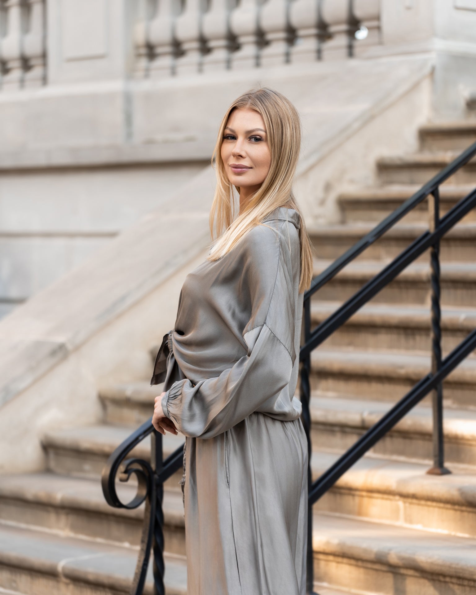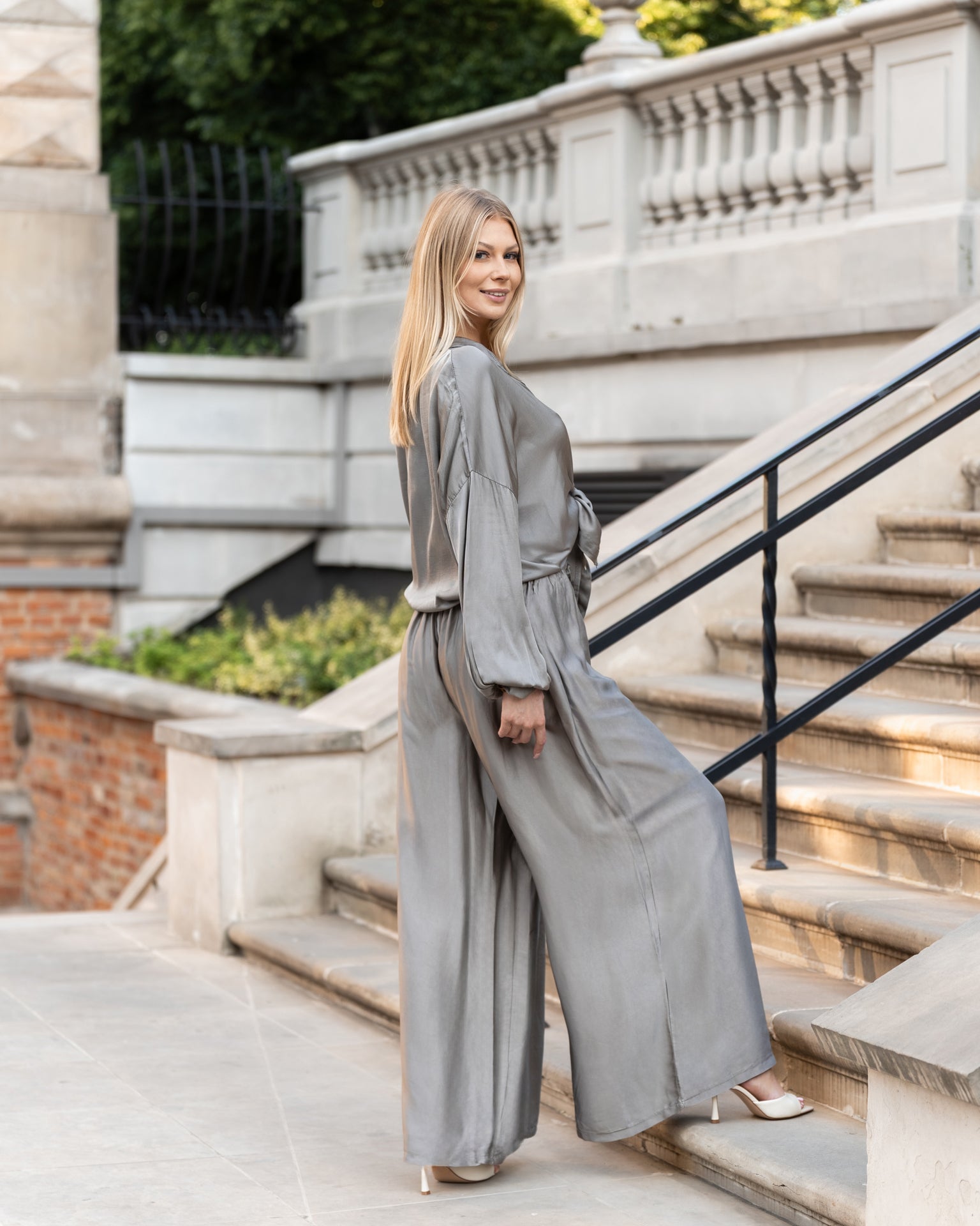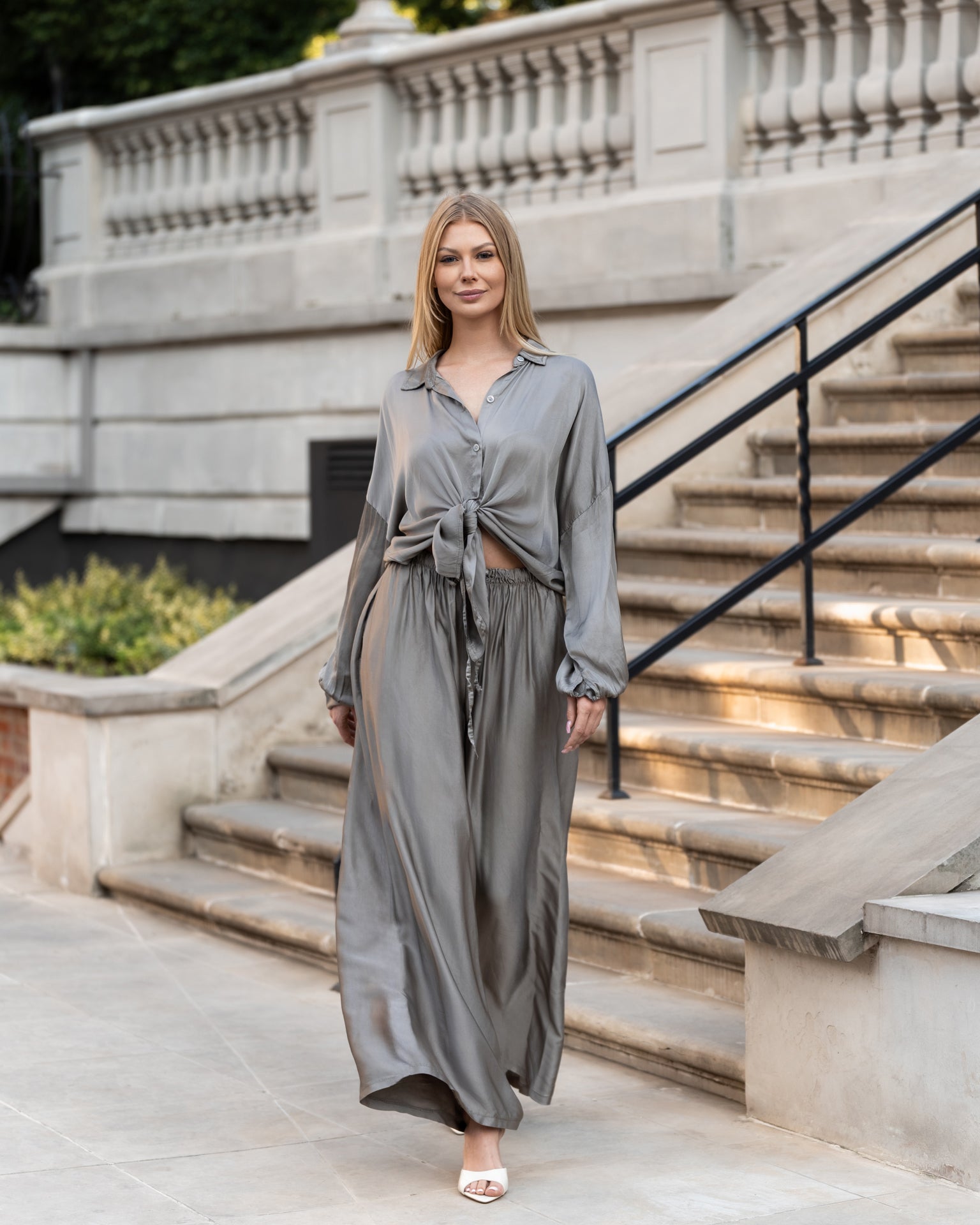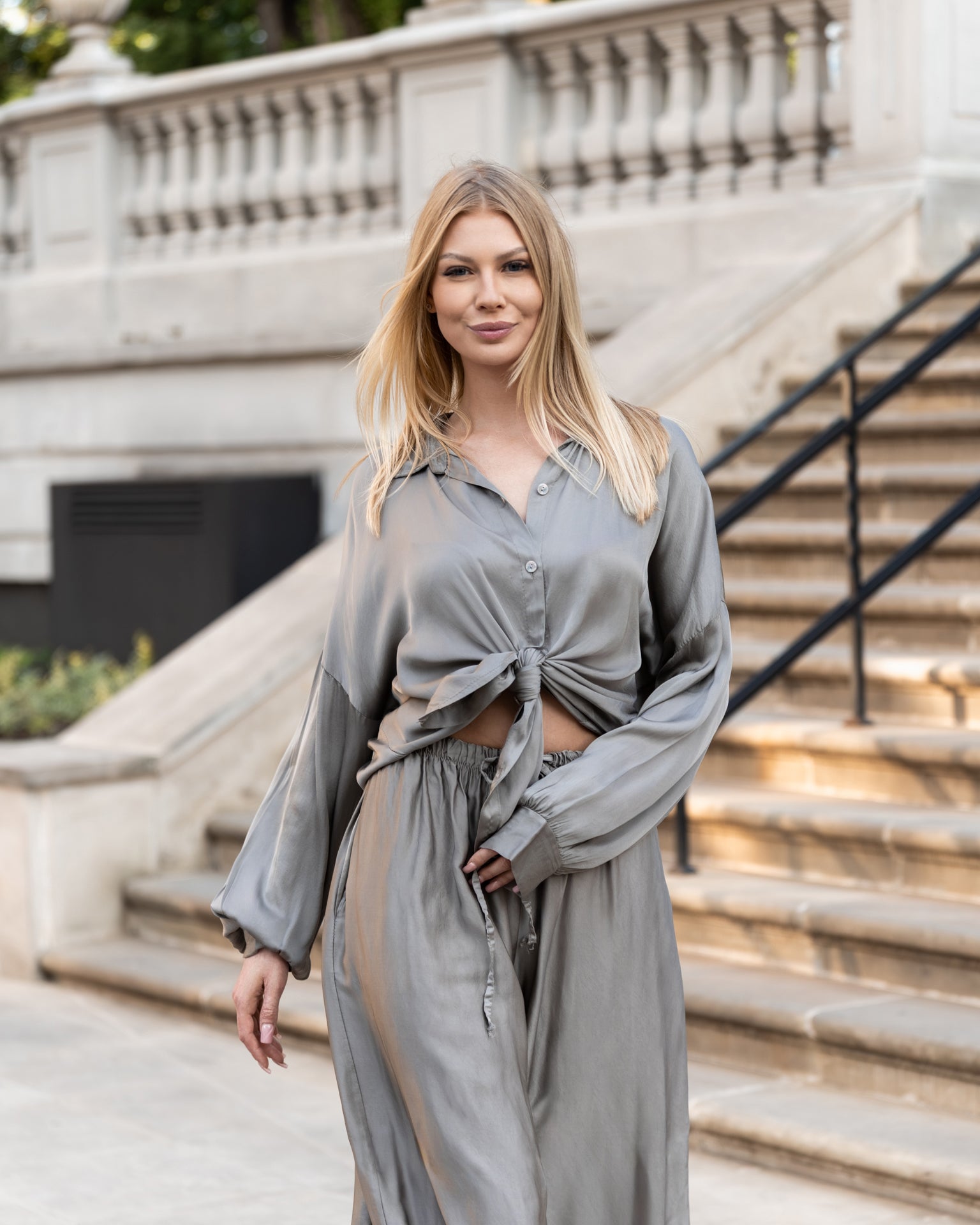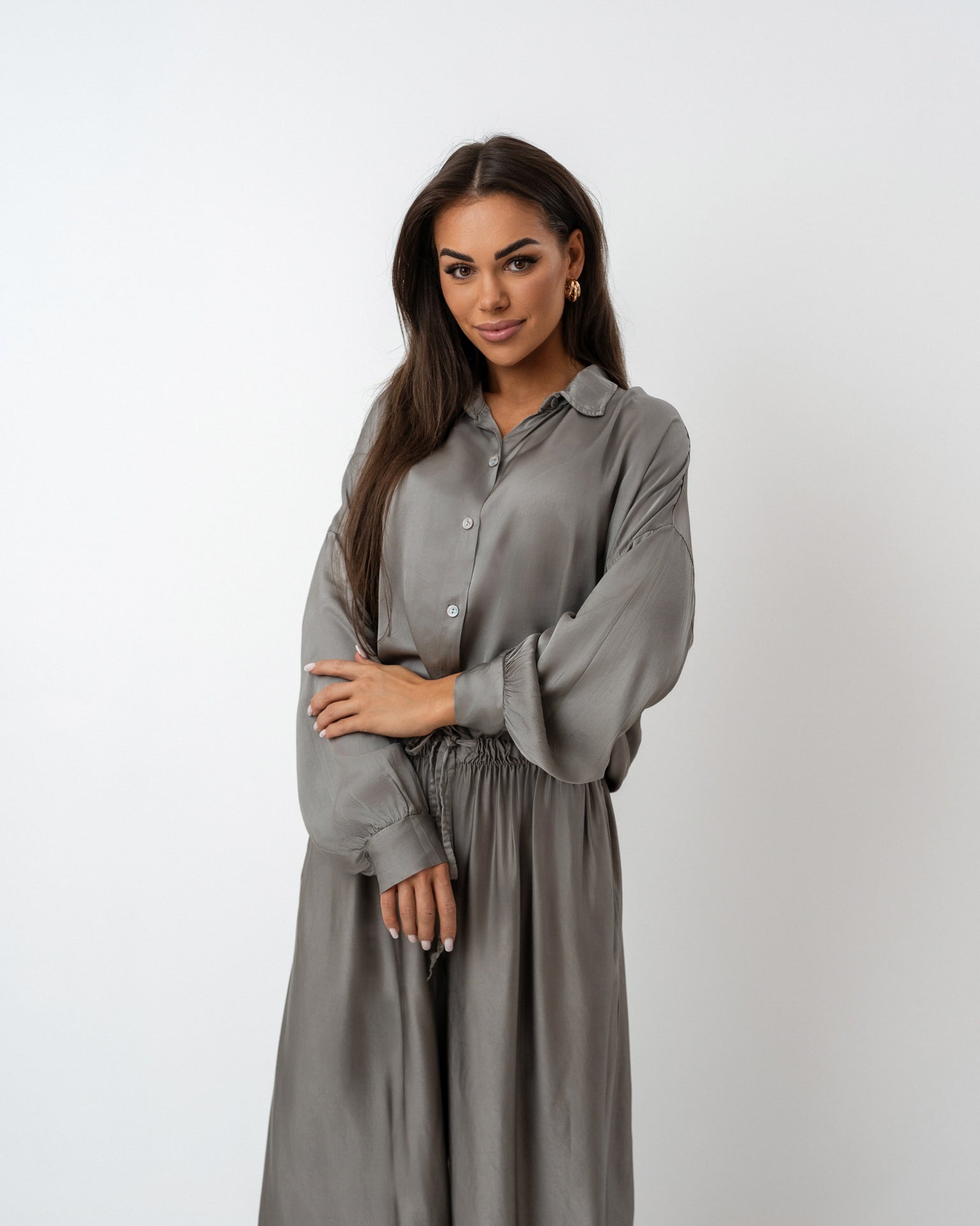 Wyjątkowy komplet w odcieniu szarego beżu uszyty z delikatnej tkaniny będącej połączeniem jedwabiu z domieszką wiskozy. Składa się z luźnej, zwiewnej koszuli z długim rękawem i wiązaniem w talii oraz szerokich, miękko układających się spodni z elastycznym pasem. Całość tworzy elegancką i zarazem wygodną stylizację o ponadczasowym charakterze.